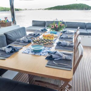 Every trip is specifically tailored to the guests’ requirements and a unique menu is designed to accommodate the dietary needs of all individuals on board. The newly upgraded bar area is generously stocked, serving handcrafted cocktails daily and providing a space for creative guests to try their hand at mixology, whenever the inspiration strikes. The boat is fully equipped with snorkeling and scuba diving gear, an abundance of water toys, a brand new 70hp Yamaha powered AB tender, stand-up paddles boards, hammocks and more. A swim ladder with a hot and cold water shower on the aft transom makes getting in and out of the ocean a seamless pleasure.