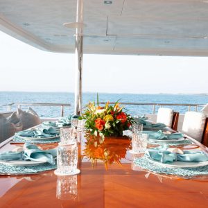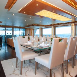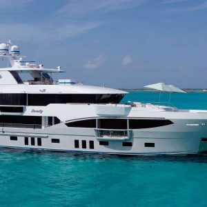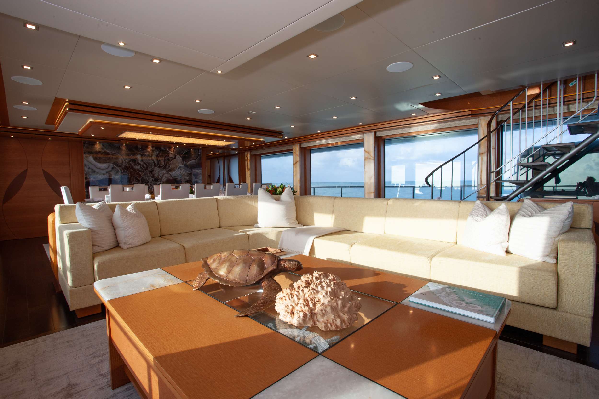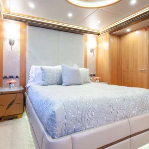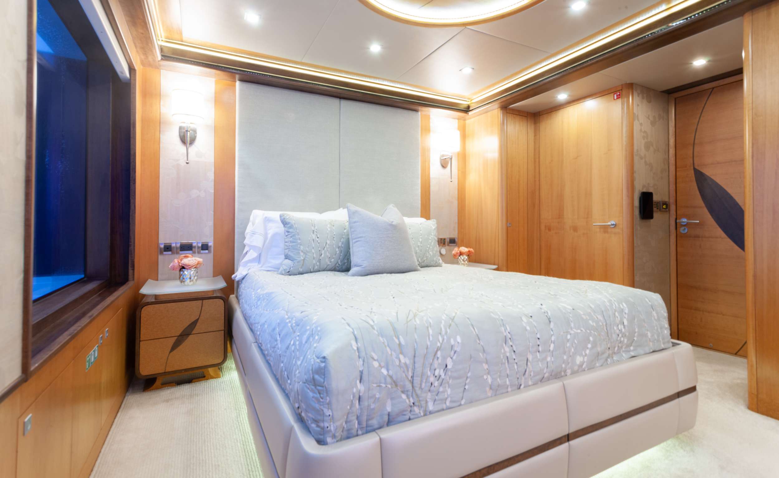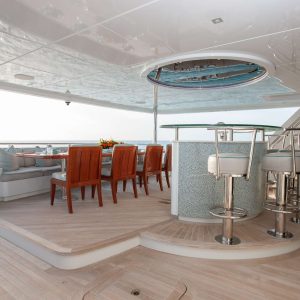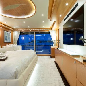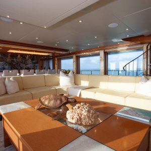 Sporting new interior furnishings and artwork following a 2023 refit, Serenity’s interior offers versatile spaces for relaxing and socializing with ambient lighting able to set any tone. The main saloon is open plan to the formal dining table, and doors lead to an inviting aft deck with statement bar counter. Ascending to the deck above, a second skylounge features a large L-shape sofa, coffee table and cocktail bar.