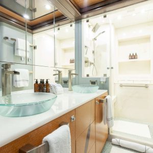 Serenity has accommodation for 12 guests in a cabin arrangement that comprises five doubles and one which is convertible between twin or double setup. The master suite resides on the main deck and benefits from his-and-hers ensuites as well as two private balconies, and there’s a generously sized VIP suite on the upper deck.