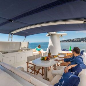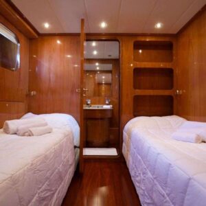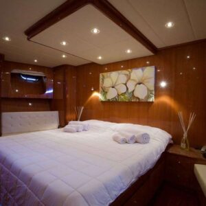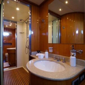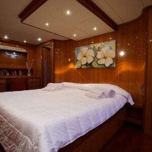 The lower deck houses the sleeping area divided into: a master cabin with a large double bathroom; a VIP suite with private bathroom; one double cabin with separate beds, all cabins are equipped with ensuite facilities.
