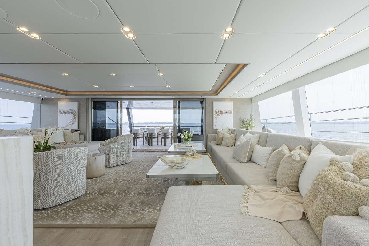 SÓL’s social spaces feature comfortable seating areas crafted from natural materials. Wraparound windows frame the light and airy main salon for ocean-view panoramas, which continue in the flybridge above. SÓL’s interior blends seamlessly with the outside through aft glass doors that open to an extensive indoor-outdoor living space.