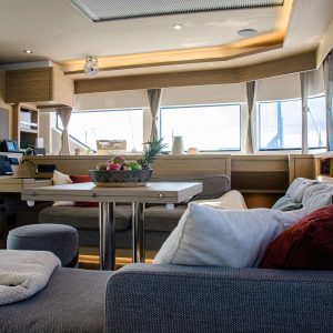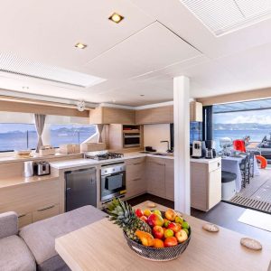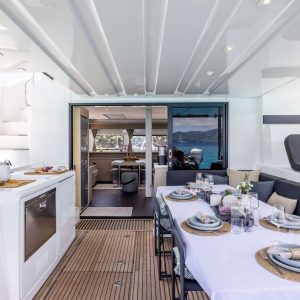 The Flybridge with a full bar and extra dining area provides an elevated, spacious, and luxurious setting for socializing and dining, offering panoramic views and enhancing the overall sailing experience.
