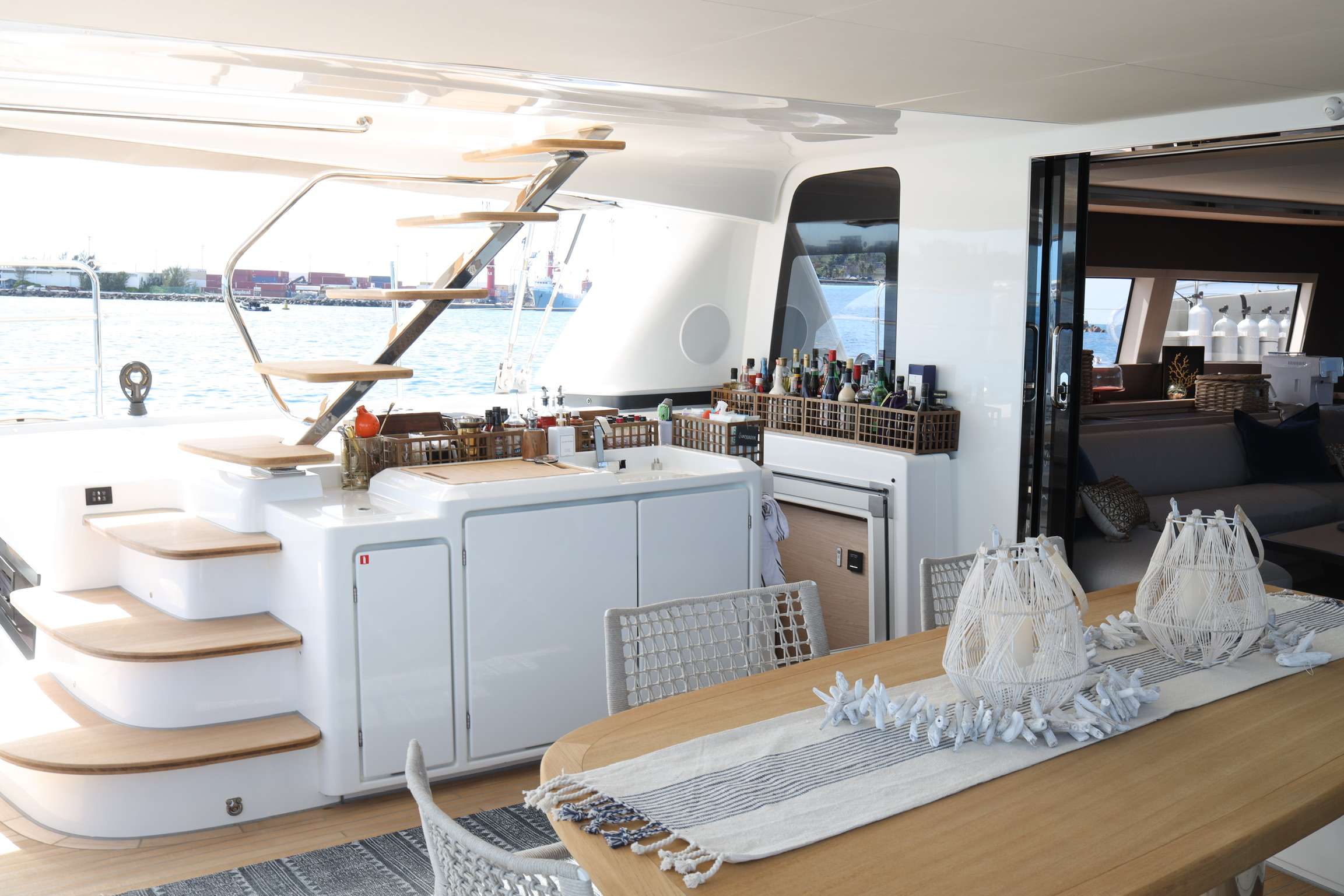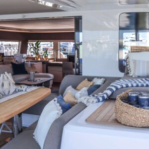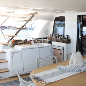 Xandros is first Lagoon SIXTY5 available for luxury charter vacation and the first of its kind to be present in and around North America. The beautiful down-galley allows for masterful culinary creations to appear out of thin air, while preserving various selections of seating and dining areas around the vessel. The completely redesigned Flybridge area highlights the future of yachting and sailing onboard catamarans with full bar, dining area, lounges and dual helms.