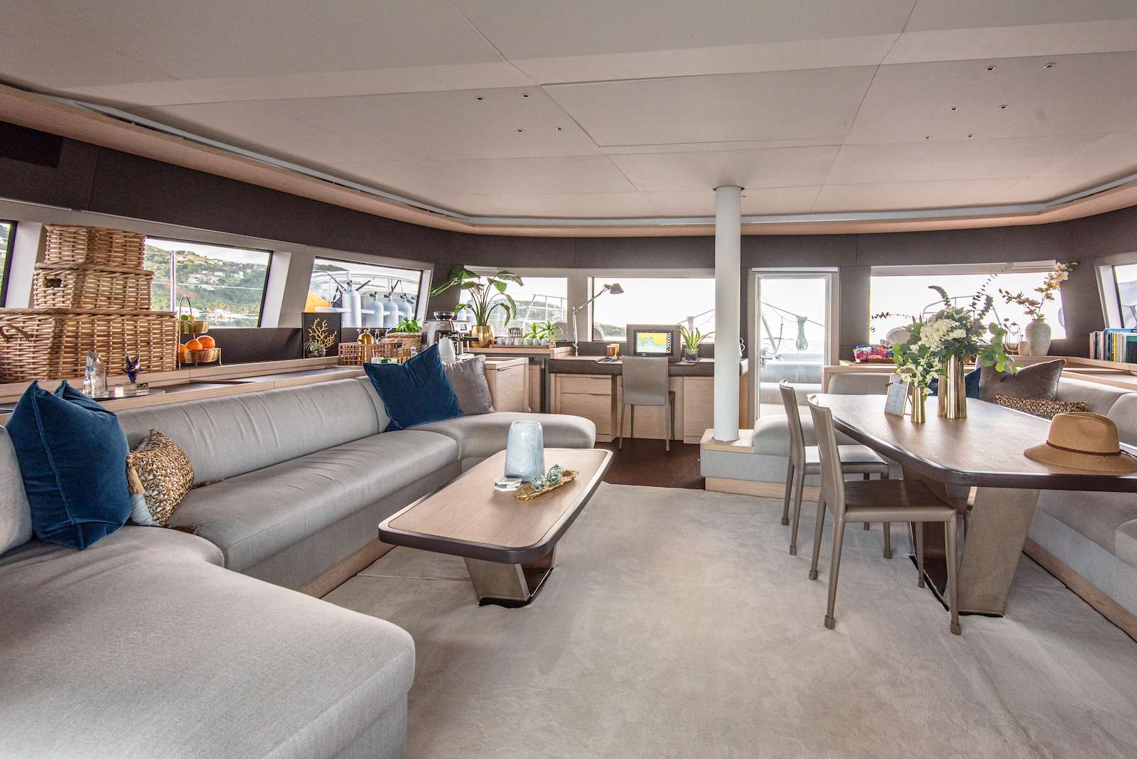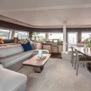 The bright and spacious saloon is located forward. It has a design palette that includes grey oak and beige upholstery for the sofas. A large dining table is positioned on the starboard side, with a u-shaped sofa and lounge area with a low coffee table on the port side. This first hull has a galley-down layout with four cabins. It delivers the massive main deck saloon space for guests to enjoy. From the saloon there is direct access to the foredeck terrace. This area offers features sofas, a coffee table and an optional canopy shade that can be installed on to stainless pillars. This space is also ideal for storing diving gear.