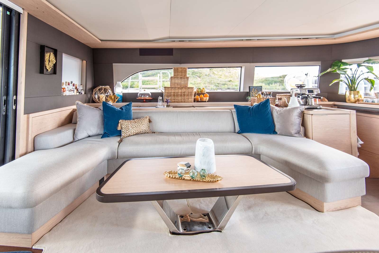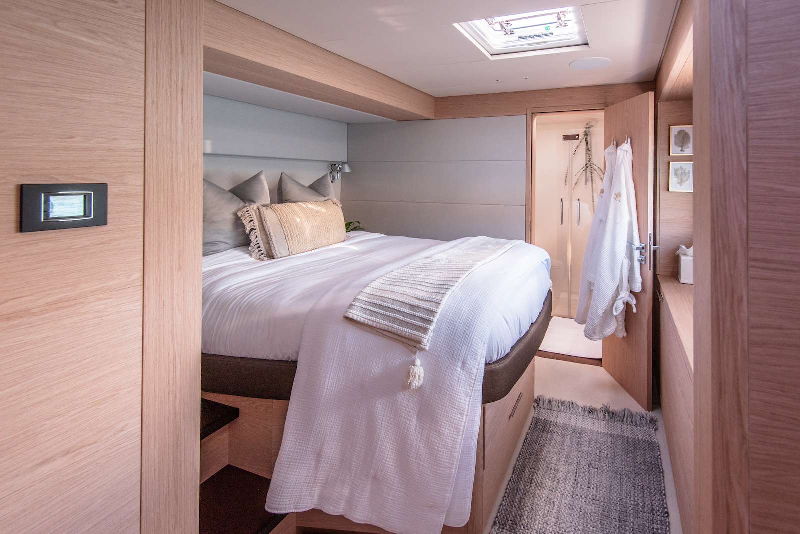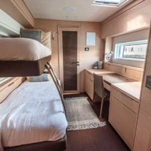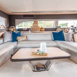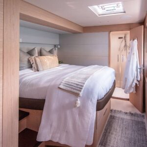 When on board the Lagoon SIXTY 5, you can look straight through fore to aft and out over your surroundings with commanding 360° views. Her elegant interior is by Nauta Design, and demonstrates the new signature “Connect” outfit from Nauta. The main saloon is comfortable and luxurious with open spaces and natural light. The same design concept has been applied to the guest cabins. They enjoy good overhead height and excellent natural light and views. The high level of finishing throughout every cabin reflects the luxury feel of the main saloon.