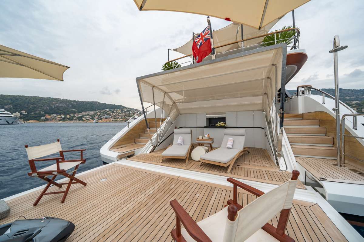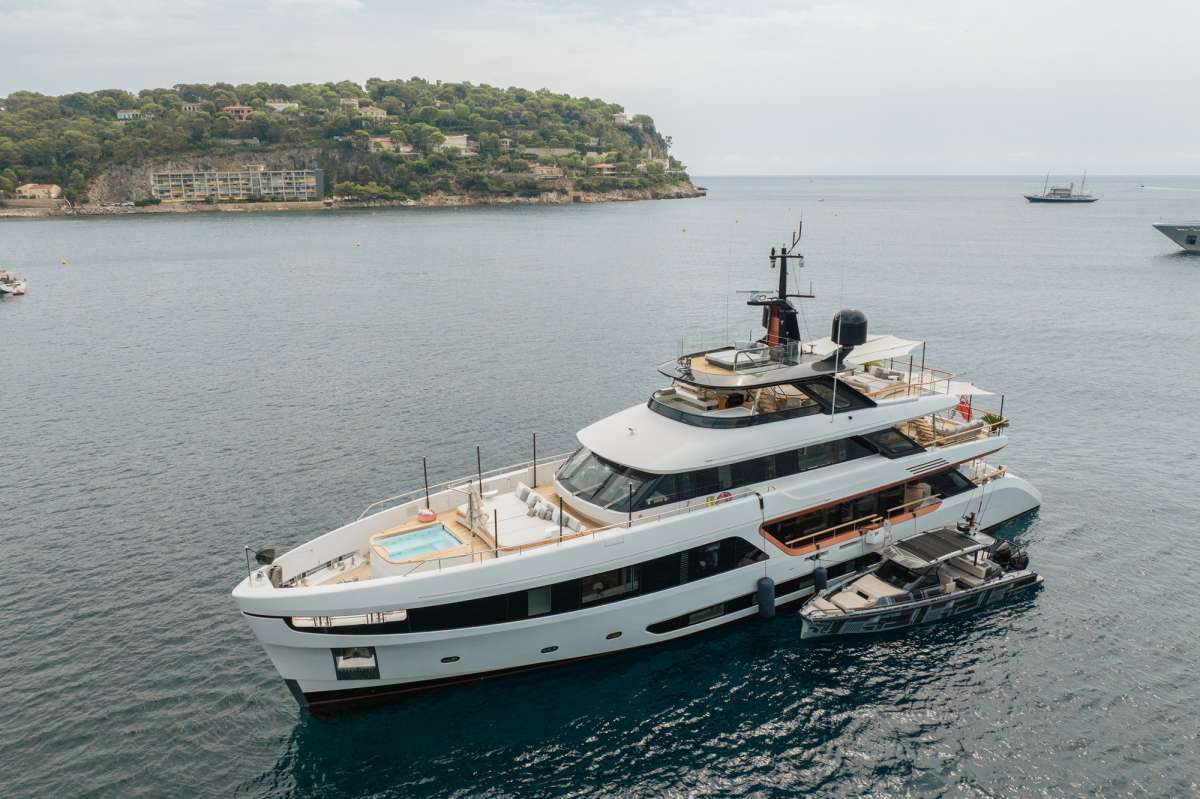 Delivered in 2023, ALLURIA’s contemporary interior, light-flooded rooms, and modern features are inspired by the glamorous Motopanfilo yachts built over 50 years ago. Accommodating 10 overnight guests in five cabins, she has a multitude of communal spaces and amenities to appeal to a mixed charter group or families alike. One of her many highlights is the ’cocoon-style’ observation deck that provides an intimate space to enjoy a morning coffee or evening sundowner while taking in sweeping views. The spacious Hamptons-style beach club invites guests to relax in the sun at sea-level and features a retractable fabric canopy providing ample shade when needed; as well as a platform for easy access when enjoying one of the yacht’s broad selection of water toys. Her foredeck outdoor pool lounge is yet another exterior space to soak up the sun, with plush sun pads and a large swimming pool. ALLURIA’s floor-to-ceiling windows, clever use of mirrors, and open-plan interior create an environment that is bright, sophisticated, and connected with the surrounding ocean. The main salon features wide-spanning windows, allowing guests to take in the incredible panoramic views even indoors, socializing on her comfortable sofa, sipping a cocktail by the cylindrical bar cabinet or enjoying a sunset dinner in her formal dining area. She provides seamless flow from the interior main salon to the main deck aft. Each of the cabins are well-appointed. The vast full-beam, on deck master suite is designed with natural light from the surrounding panoramic windows. It also features a private seating space that can be used as an office, a vanity and a generous en suite bathroom. Her four additional guest cabins are well-appointed and ideal for families, mixed groups and couples.