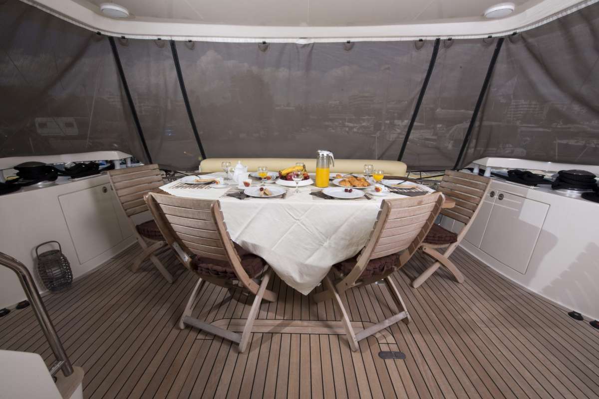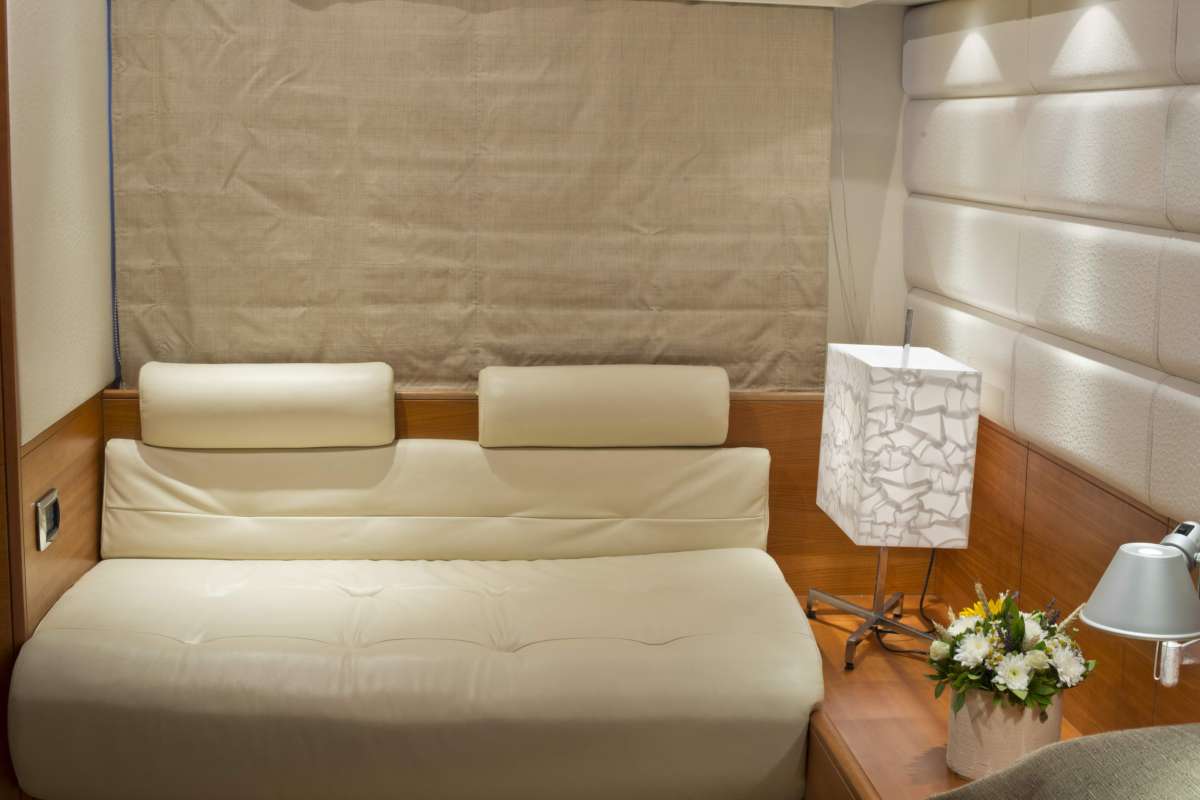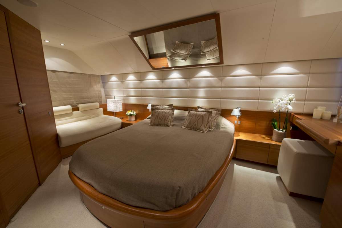 The Master cabin is amidships and full beam of the yacht, with a center lined queen size bed, sofa, vanity, walk in wardrobe and en-suite facilities.